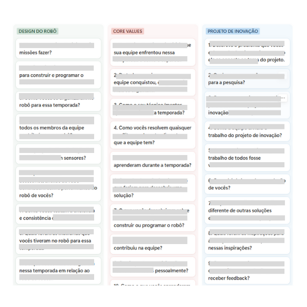 O Banco de Perguntas FLL é um material estruturado com perguntas organizadas nas três categorias da sala de avaliação: